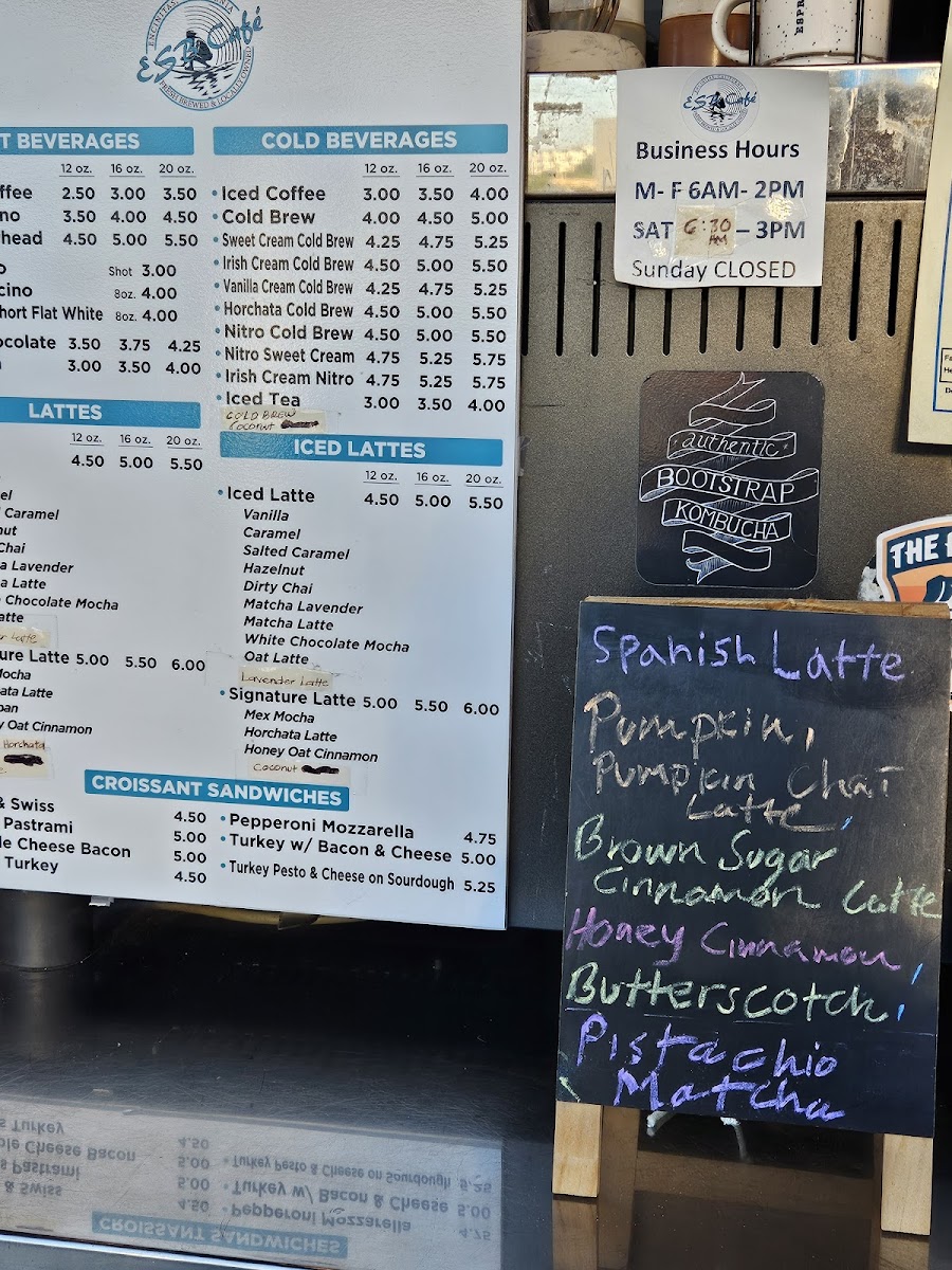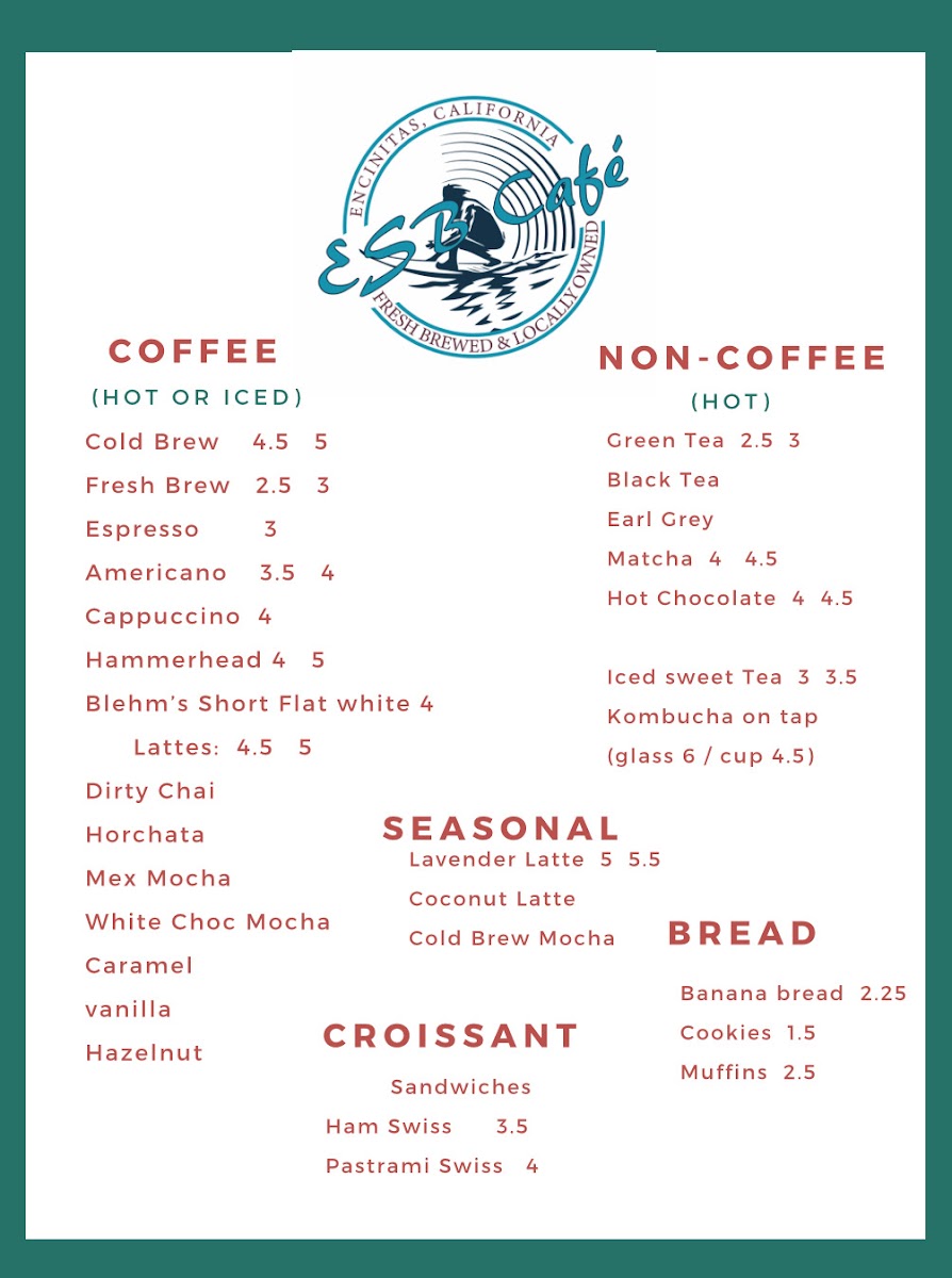 From a reviewer's perspective, E.s.b. Cafe at 325 Encinitas Blvd, Encinitas, CA 92024 offers a menu that balances both creativity and comfort. The Seasonal drinks, such as the Dirty Chai, Horchata, Mex Mocha, White Choc Mocha, and Caramel, provide a flavorful twist for those looking to indulge in something special. Coffee enthusiasts will appreciate staples like Cold Brew, Fresh Brew, Espresso, Americano, and Cappuccino, all crafted to highlight rich, robust flavors. For light bites, the Croissant options-Ham Swiss and Pastrami Swiss-deliver satisfying savory notes, while the Bread selection, including Banana Bread, Cookies, and Muffins, caters to a sweet tooth or a quick snack. Non-coffee drinkers are not left behind, with offerings such as Green Tea, Black Tea, Earl Grey, Matcha, and Hot Chocolate ensuring a well-rounded beverage experience. Overall, the menu at E.s.b. Cafe combines classic café favorites with seasonal and specialty drinks, making it an inviting spot for both casual visitors and devoted coffee lovers.